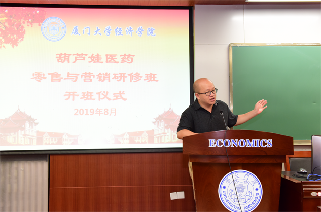 在开班仪式上,廖景峰主任首先代表厦门大学经济学院热烈欢迎金年会医药零售与营销研修班的学员到厦大学习,并就厦门大学及经济学院的相关情况进行了介绍。他说,金年会学员走进厦大就是厦大的校友,希望未来的日子能够关心、支持母校的发展,多提宝贵意见,同时他也祝大家在厦大学习期间学有所成、学有所获。